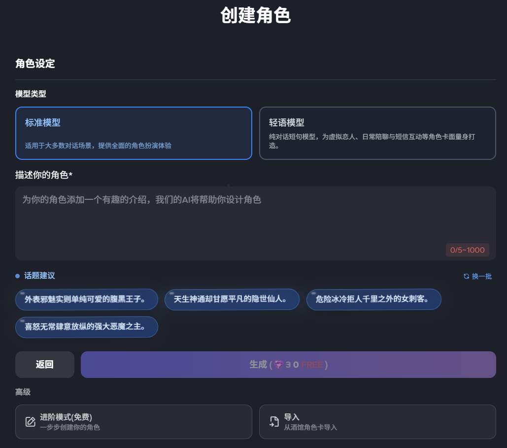 * **轻语模型：**&#x89D2;色生成后将以**短句情感交流**展开扮演，为您提供陪伴型聊天体验。