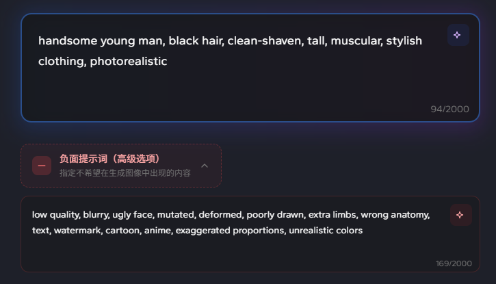 * **提示词（Prompt）**：**告诉 AI 您想生成什么**。例如“handsome young man, black hair, clean-shaven, tall, muscular, stylish clothing, photorealistic”。