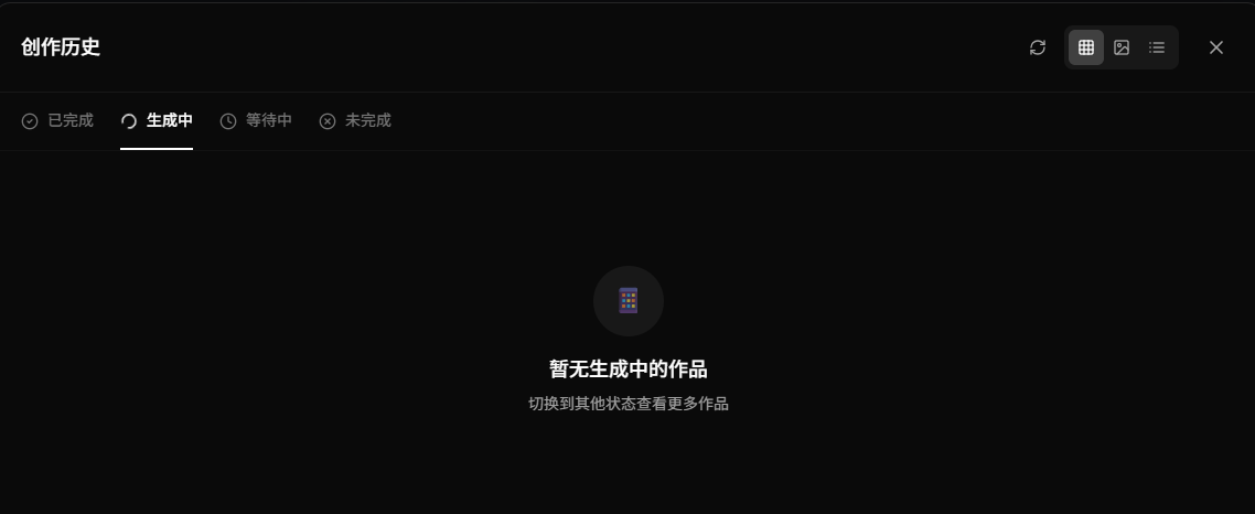 生图结果可以在 **创作历史** 查看：已完成 / 生成中 / 等待中 / 未完成。未完成的生图所消耗的积分会**自动退回**。