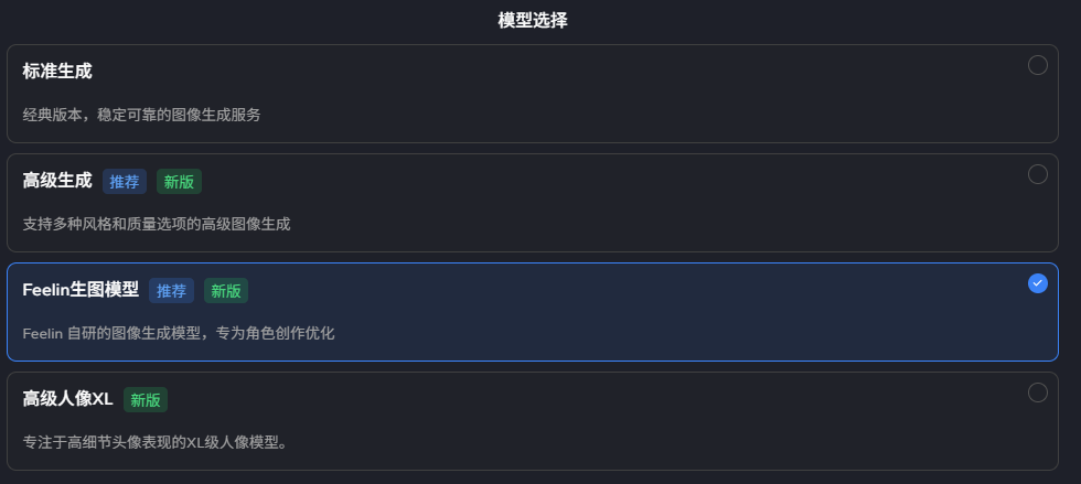 | **Feelin 生图模型（推荐）** | Feelin自研生图模型，支持中文自然语言生图，专为角色创作优化 |