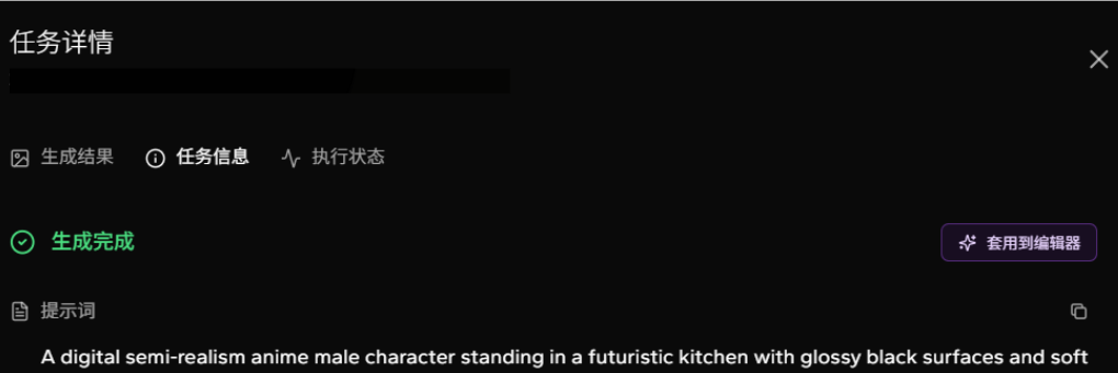 在创作历史中，如若您有喜好并希望复用的**原图设定**，可以点击此图片，再选择**任务信息**，一键选择**套用到编辑器**，即可将此图片生成时采用的**所有设定一键复制到新生成页面**。
