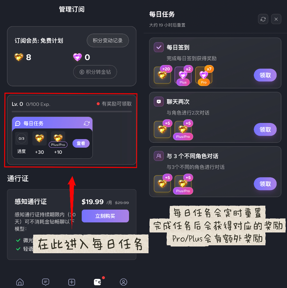 每日任务会定时重置，完成任务后会获得对应的奖励，Pro/Plus会有额外奖励